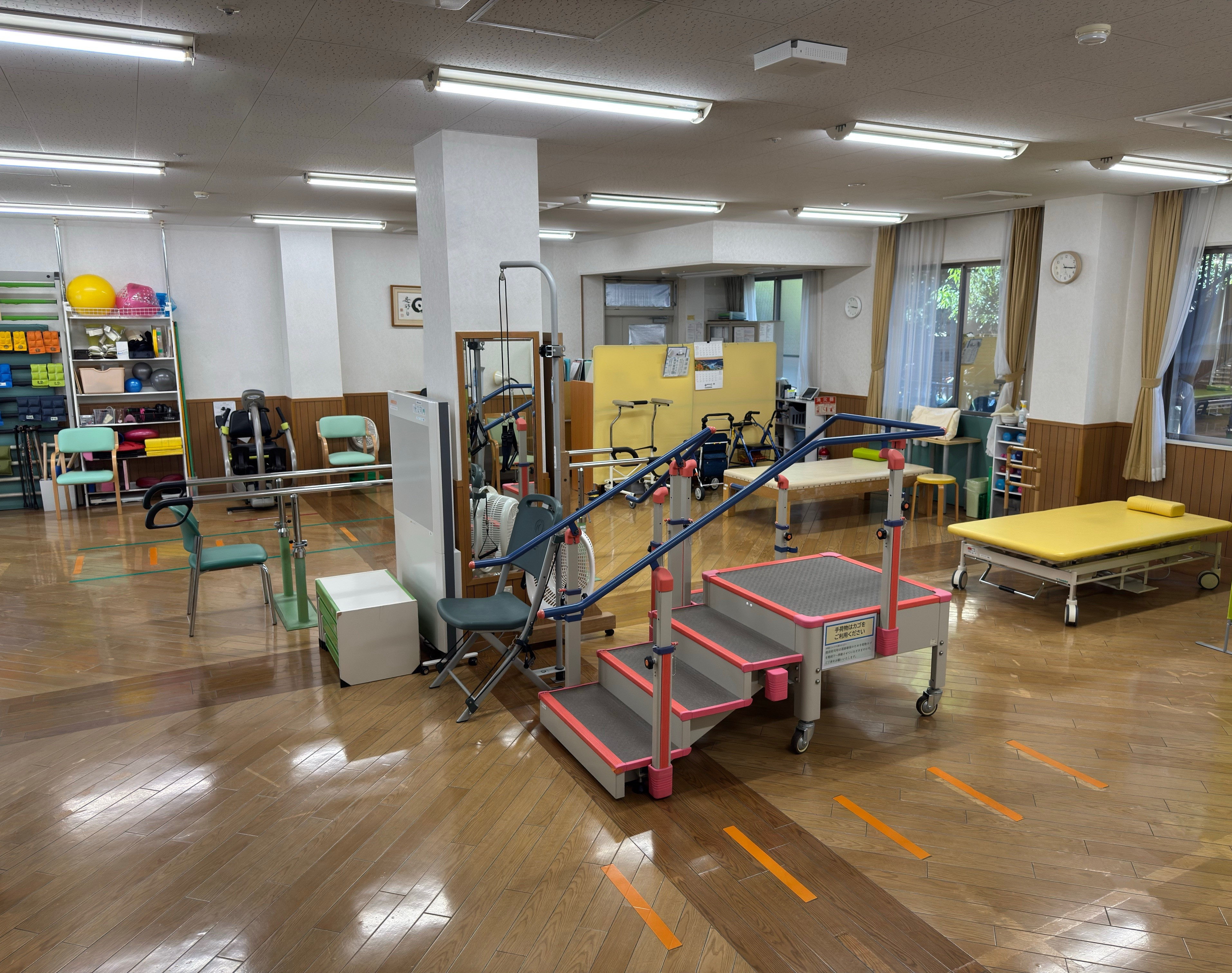 リハビリテーション科には理学療法士が在籍しており、約100m²の広々としたリハビリ室を有しています。